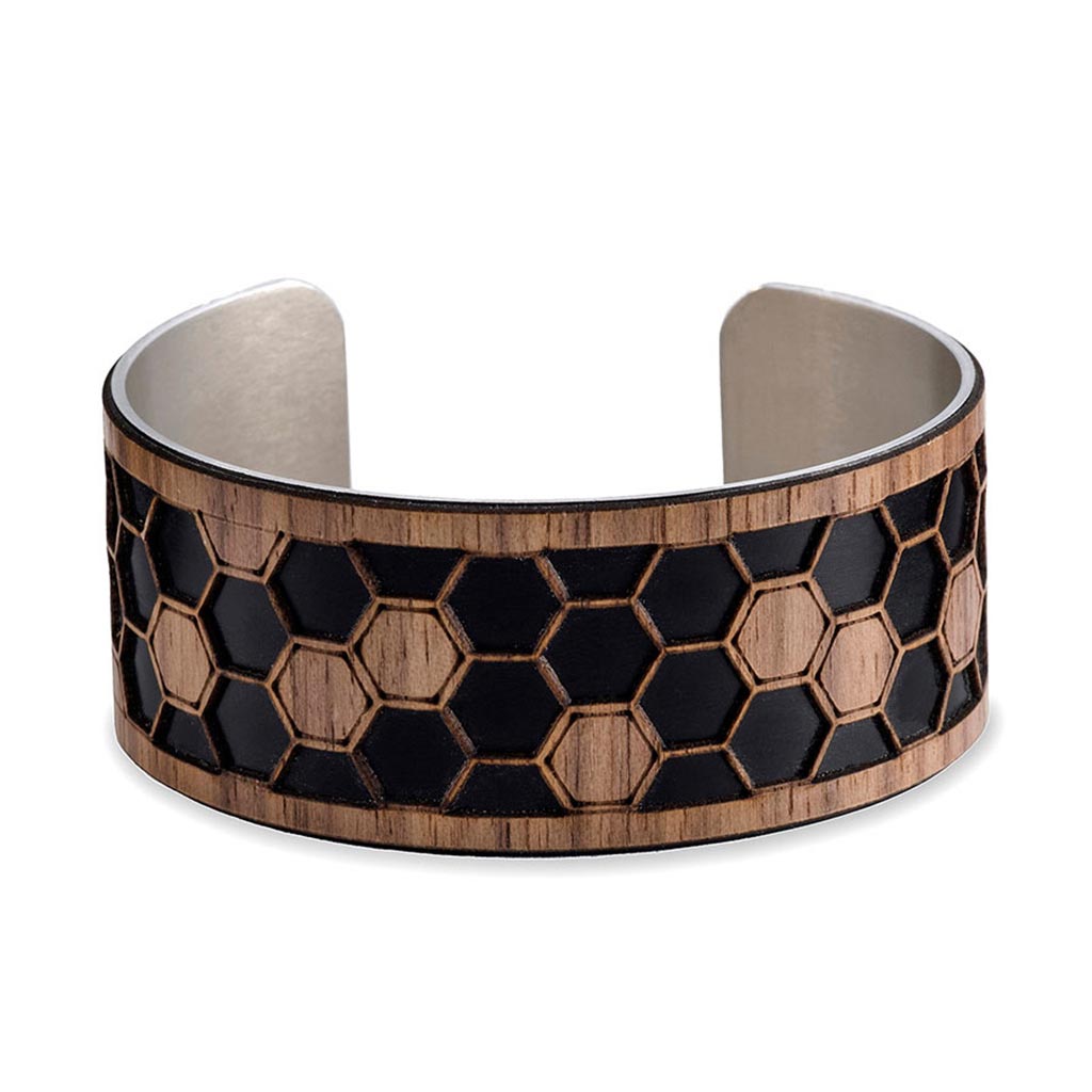 Lightweight, comfortable, adjustable - our honeycomb cuff bracelet is all three. Hand-formed aluminum contrasts with rich wood to make a beautifully simple statement.